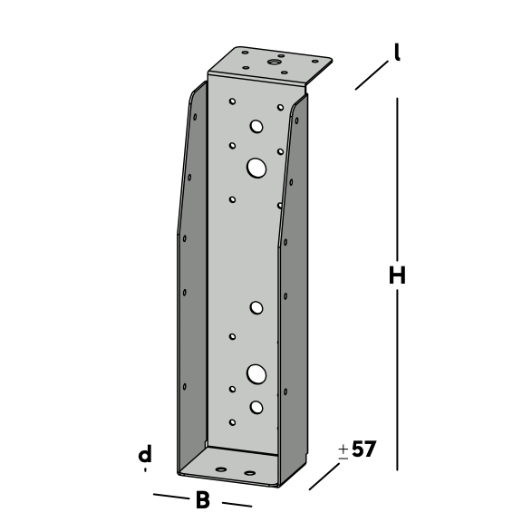 Balkdrager met lange lip, voor het verbinden van dwarsbalken aan een hoofdbalk (moerbalk). De balkdrager rust met de lip op de hoofdbalk en wordt via de gaten in de rug bevestigd. Hierna wordt een dwarsbalk ingelegd die via de gaten in de zijkant van de balkdrager kan worden gefixeerd.