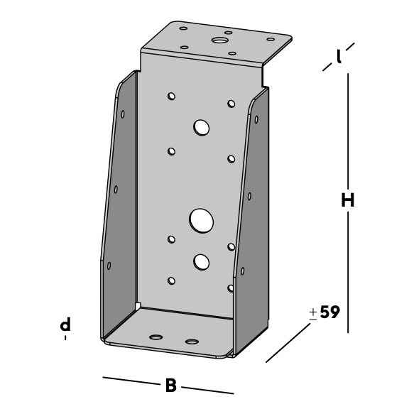 Balkdrager met lange lip, voor het verbinden van dwarsbalken aan een hoofdbalk (moerbalk). De balkdrager rust met de lip op de hoofdbalk en wordt via de gaten in de rug bevestigd. Hierna wordt een dwarsbalk ingelegd die via de gaten in de zijkant van de balkdrager kan worden gefixeerd.