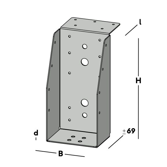 Balkdrager met lange lip, voor het verbinden van dwarsbalken aan een hoofdbalk (moerbalk). De balkdrager rust met de lip op de hoofdbalk en wordt via de gaten in de rug bevestigd. Hierna wordt een dwarsbalk ingelegd die via de gaten in de zijkant van de balkdrager kan worden gefixeerd.