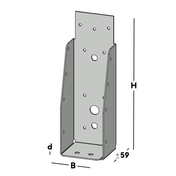 Balkdrager voor het verbinden van dwarsbalken rechtstreeks aan een muur. De balkdrager wordt via de gaten in de rug bevestigd. Hierna wordt een balk ingelegd die via de gaten in de zijkant van de balkdrager kan worden gefixeerd.