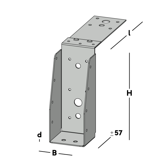 Balkdrager met lange lip, voor het verbinden van dwarsbalken aan een hoofdbalk (moerbalk). De balkdrager rust met de lip op de hoofdbalk en wordt via de gaten in de rug bevestigd. Hierna wordt een dwarsbalk ingelegd die via de gaten in de zijkant van de balkdrager kan worden gefixeerd.