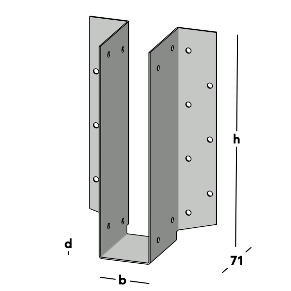 Balkdrager met zijflenzen, voor het bevestigen van dwarsbalken tegen een muur of tegen een andere houten balk. Wordt voornamelijk gebruikt voor houten I-liggers. Leverbaar voor de gangbare kopmaten I-liggers.