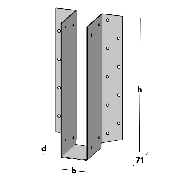 Balkdrager met zijflenzen, voor het bevestigen van dwarsbalken tegen een muur of tegen een andere houten balk. Wordt voornamelijk gebruikt voor houten I-liggers. Leverbaar voor de gangbare kopmaten I-liggers.