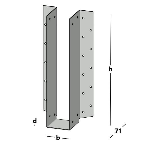 Balkdrager met zijflenzen, voor het bevestigen van dwarsbalken tegen een muur of tegen een andere houten balk. Wordt voornamelijk gebruikt voor houten I-liggers. Leverbaar voor de gangbare kopmaten I-liggers.