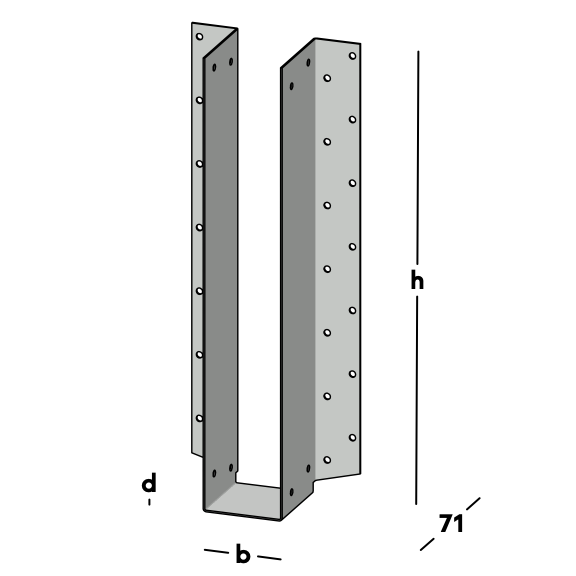 Balkdrager met zijflenzen, voor het bevestigen van dwarsbalken tegen een muur of tegen een andere houten balk. Wordt voornamelijk gebruikt voor houten I-liggers. Leverbaar voor de gangbare kopmaten I-liggers.