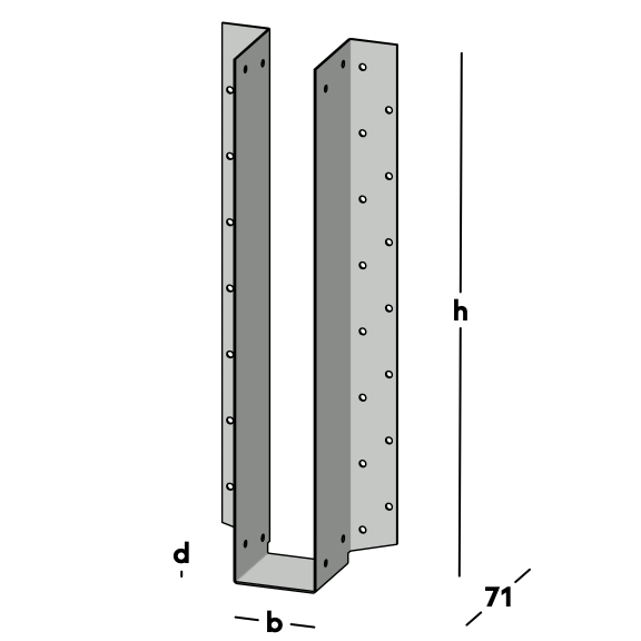 Balkdrager met zijflenzen, voor het bevestigen van dwarsbalken tegen een muur of tegen een andere houten balk. Wordt voornamelijk gebruikt voor houten I-liggers. Leverbaar voor de gangbare kopmaten I-liggers.