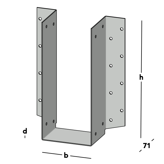 Balkdrager met zijflenzen, voor het bevestigen van dwarsbalken tegen een muur of tegen een andere houten balk. Wordt voornamelijk gebruikt voor houten I-liggers. Leverbaar voor de gangbare kopmaten I-liggers.