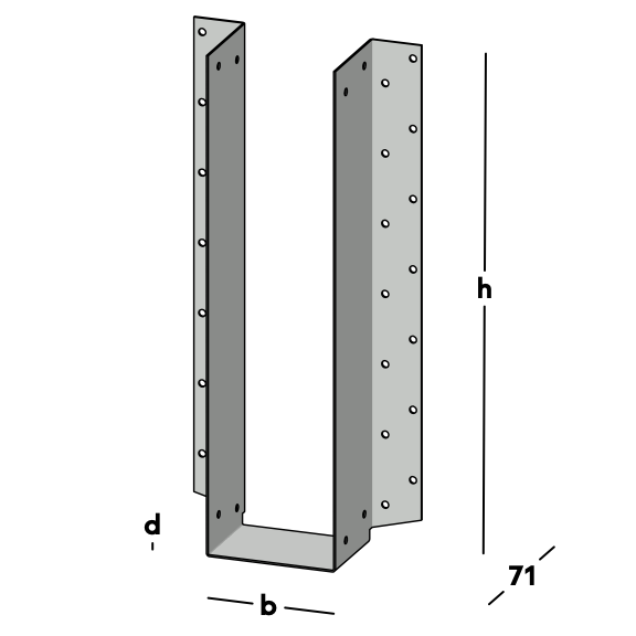 Balkdrager met zijflenzen, voor het bevestigen van dwarsbalken tegen een muur of tegen een andere houten balk. Wordt voornamelijk gebruikt voor houten I-liggers. Leverbaar voor de gangbare kopmaten I-liggers.
