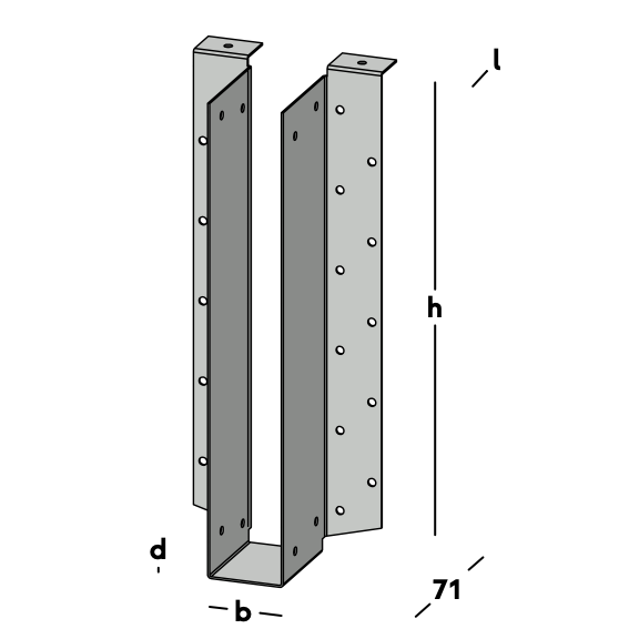 Balkdrager met zijflenzen, voor het bevestigen van dwarsbalken tegen een muur of tegen een andere houten balk. Wordt voornamelijk gebruikt voor houten I-liggers. Leverbaar voor de gangbare kopmaten I-liggers.