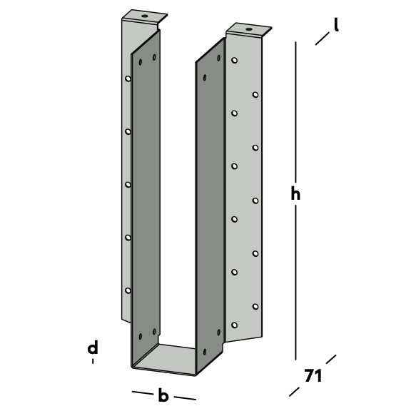 Balkdrager met zijflenzen, voor het bevestigen van dwarsbalken tegen een muur of tegen een andere houten balk. Wordt voornamelijk gebruikt voor houten I-liggers. Leverbaar voor de gangbare kopmaten I-liggers.