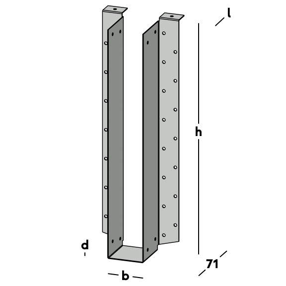 Balkdrager met zijflenzen, voor het bevestigen van dwarsbalken tegen een muur of tegen een andere houten balk. Wordt voornamelijk gebruikt voor houten I-liggers. Leverbaar voor de gangbare kopmaten I-liggers.