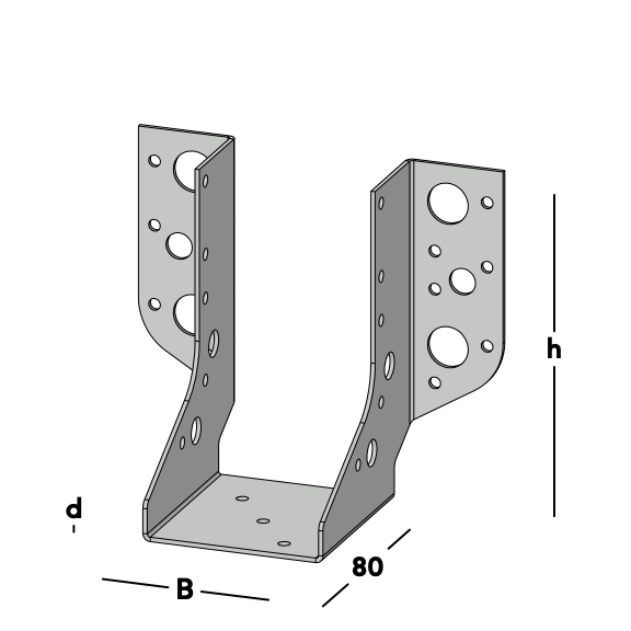 Balkdrager met zijflenzen, voor het bevestigen van dwarsbalken rechtstreeks tegen een muur of tegen een andere houten balk. Leverbaar voor de gangbare kopmaten geschaafd hout.