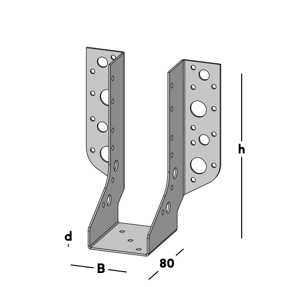 Balkdrager met zijflenzen, voor het bevestigen van dwarsbalken rechtstreeks tegen een muur of tegen een andere houten balk. Leverbaar voor de gangbare kopmaten geschaafd hout.