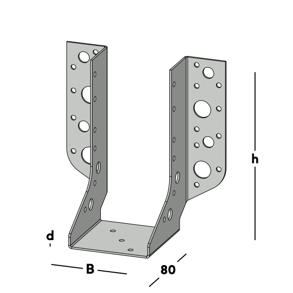 Balkdrager met zijflenzen, voor het bevestigen van dwarsbalken rechtstreeks tegen een muur of tegen een andere houten balk. Leverbaar voor de gangbare kopmaten geschaafd hout.