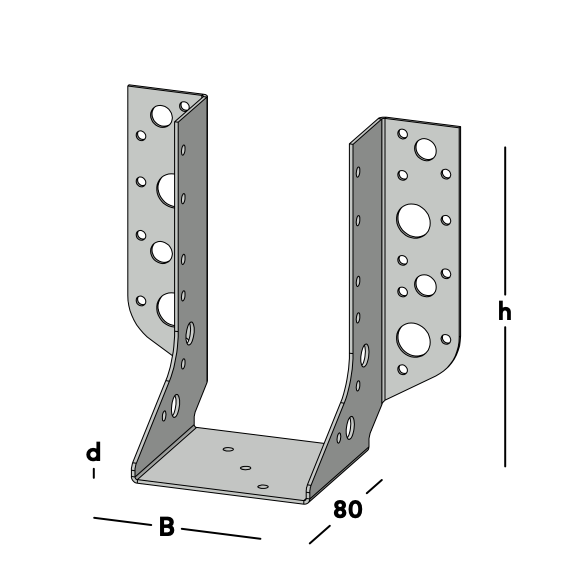 Balkdrager met zijflenzen, voor het bevestigen van dwarsbalken rechtstreeks tegen een muur of tegen een andere houten balk. Leverbaar voor de gangbare kopmaten geschaafd hout.