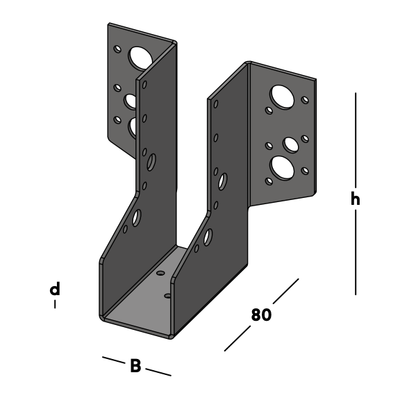 Balkdrager met zijflenzen, voor het bevestigen van dwarsbalken tegen een muur of tegen een andere houten balk. Deze balkdrager wordt ook toegepast voor het maken van ravelingen in vloeren en daken. Leverbaar voor de gangbare kopmaten van zowel geschaafd als ongeschaafd hout.