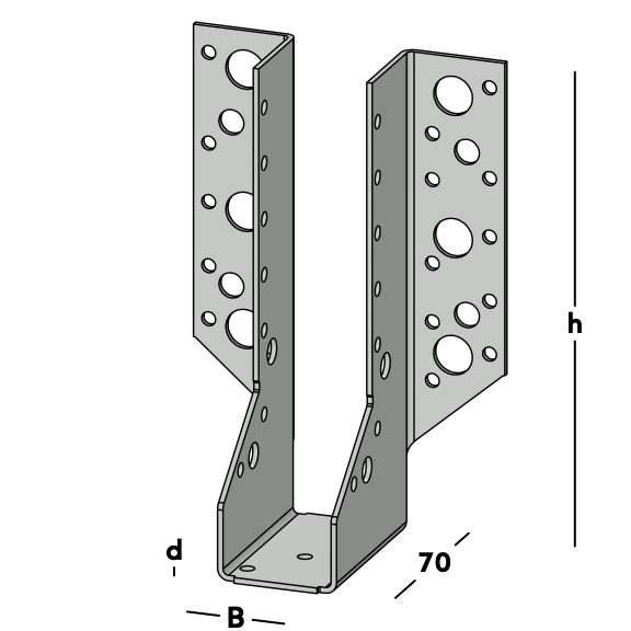Balkdrager met zijflenzen, voor het bevestigen van dwarsbalken tegen een muur of tegen een andere houten balk. Deze balkdrager wordt ook toegepast voor het maken van ravelingen in vloeren en daken. Leverbaar voor de gangbare kopmaten van zowel geschaafd als ongeschaafd hout.