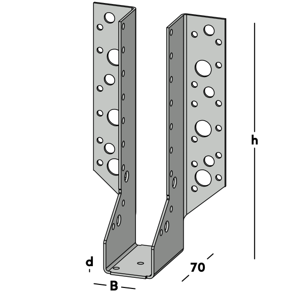 Balkdrager met zijflenzen, voor het bevestigen van dwarsbalken tegen een muur of tegen een andere houten balk. Deze balkdrager wordt ook toegepast voor het maken van ravelingen in vloeren en daken. Leverbaar voor de gangbare kopmaten van zowel geschaafd als ongeschaafd hout.