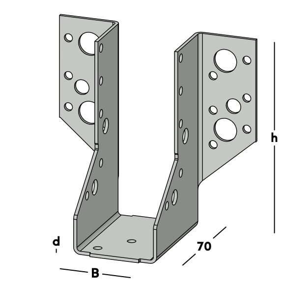 Balkdrager met zijflenzen, voor het bevestigen van dwarsbalken tegen een muur of tegen een andere houten balk. Deze balkdrager wordt ook toegepast voor het maken van ravelingen in vloeren en daken. Leverbaar voor de gangbare kopmaten van zowel geschaafd als ongeschaafd hout.