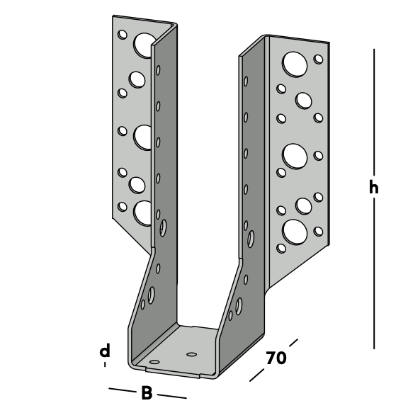 Balkdrager met zijflenzen, voor het bevestigen van dwarsbalken tegen een muur of tegen een andere houten balk. Deze balkdrager wordt ook toegepast voor het maken van ravelingen in vloeren en daken. Leverbaar voor de gangbare kopmaten van zowel geschaafd als ongeschaafd hout.