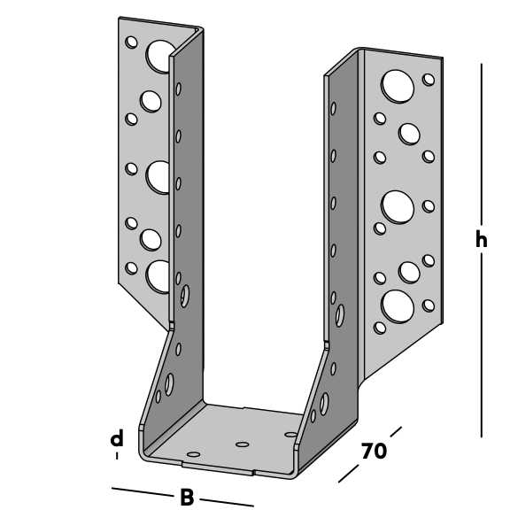 Balkdrager met zijflenzen, voor het bevestigen van dwarsbalken tegen een muur of tegen een andere houten balk. Deze balkdrager wordt ook toegepast voor het maken van ravelingen in vloeren en daken. Leverbaar voor de gangbare kopmaten van zowel geschaafd als ongeschaafd hout.