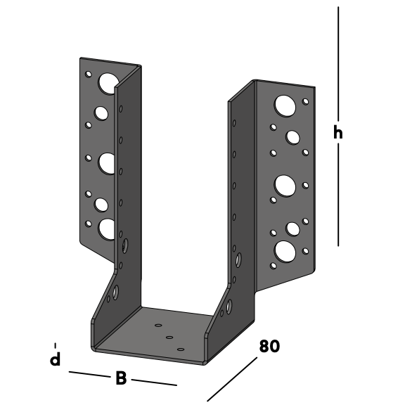 Balkdrager met zijflenzen, voor het bevestigen van dwarsbalken tegen een muur of tegen een andere houten balk. Deze balkdrager wordt ook toegepast voor het maken van ravelingen in vloeren en daken. Leverbaar voor de gangbare kopmaten van zowel geschaafd als ongeschaafd hout.