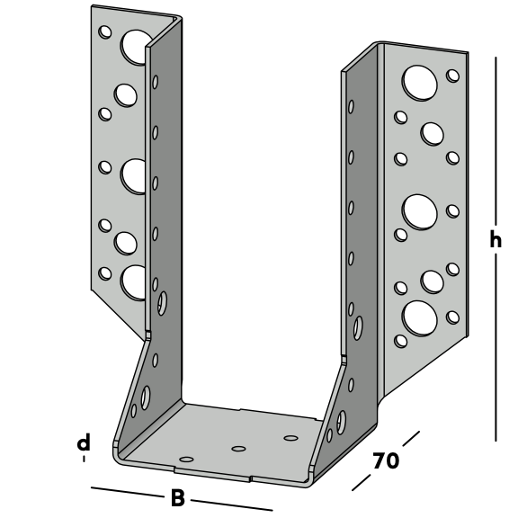 Balkdrager met zijflenzen, voor het bevestigen van dwarsbalken tegen een muur of tegen een andere houten balk. Deze balkdrager wordt ook toegepast voor het maken van ravelingen in vloeren en daken. Leverbaar voor de gangbare kopmaten van zowel geschaafd als ongeschaafd hout.