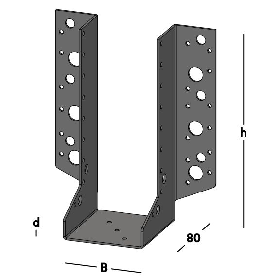 Balkdrager met zijflenzen, voor het bevestigen van dwarsbalken tegen een muur of tegen een andere houten balk. Deze balkdrager wordt ook toegepast voor het maken van ravelingen in vloeren en daken. Leverbaar voor de gangbare kopmaten van zowel geschaafd als ongeschaafd hout.