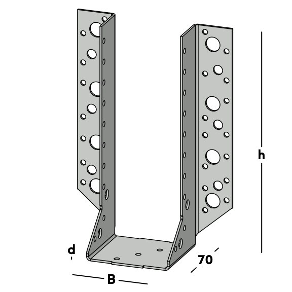 Balkdrager met zijflenzen, voor het bevestigen van dwarsbalken tegen een muur of tegen een andere houten balk. Deze balkdrager wordt ook toegepast voor het maken van ravelingen in vloeren en daken. Leverbaar voor de gangbare kopmaten van zowel geschaafd als ongeschaafd hout.