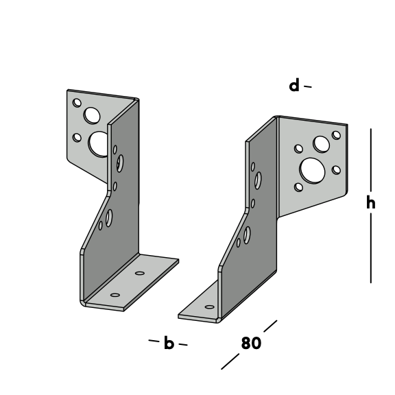 Balkdrager uit twee delen met zijflens, voor het bevestigen van dwarsbalken tegen een muur of tegen een andere houten balk. Doordat de drager uit twee delen bestaat kan deze ingezet worden voor allerlei (niet standaard) houtmaten.