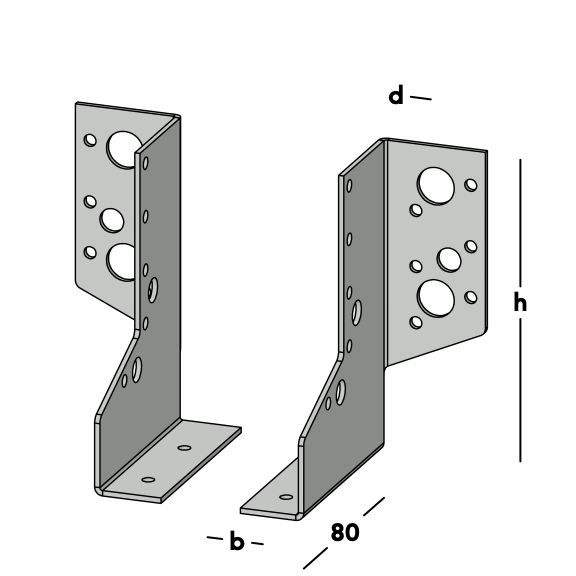 Balkdrager uit twee delen met zijflens, voor het bevestigen van dwarsbalken tegen een muur of tegen een andere houten balk. Doordat de drager uit twee delen bestaat kan deze ingezet worden voor allerlei (niet standaard) houtmaten.