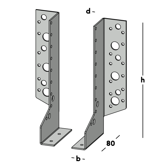 Balkdrager uit twee delen met zijflens, voor het bevestigen van dwarsbalken tegen een muur of tegen een andere houten balk. Doordat de drager uit twee delen bestaat kan deze ingezet worden voor allerlei (niet standaard) houtmaten.