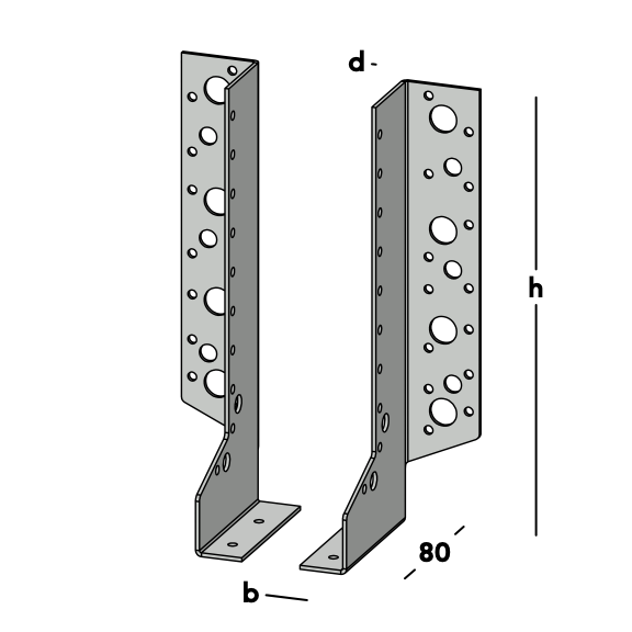 Balkdrager uit twee delen met zijflens, voor het bevestigen van dwarsbalken tegen een muur of tegen een andere houten balk. Doordat de drager uit twee delen bestaat kan deze ingezet worden voor allerlei (niet standaard) houtmaten.