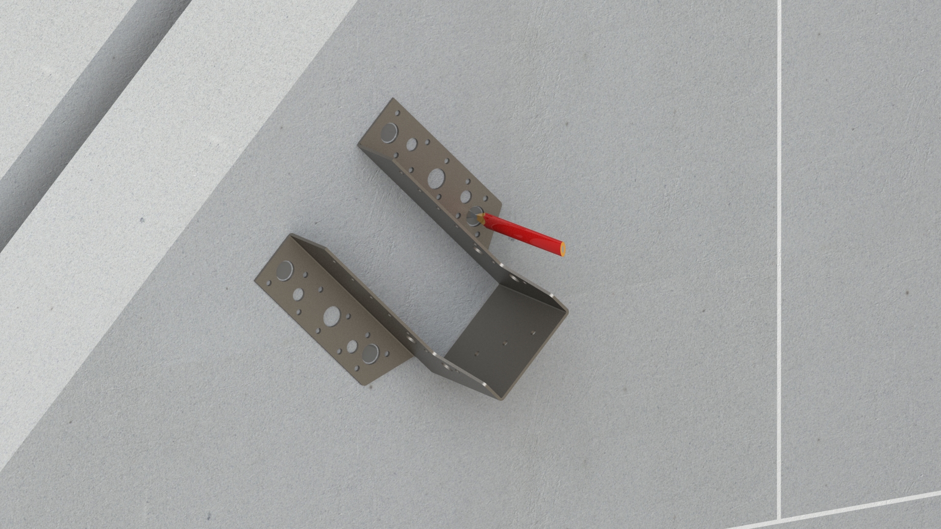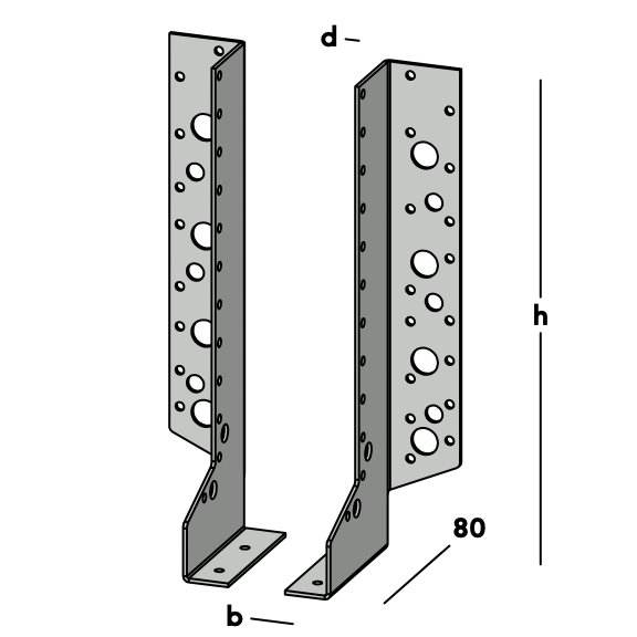 Balkdrager uit twee delen met zijflens, voor het bevestigen van dwarsbalken tegen een muur of tegen een andere houten balk. Doordat de drager uit twee delen bestaat kan deze ingezet worden voor allerlei (niet standaard) houtmaten.