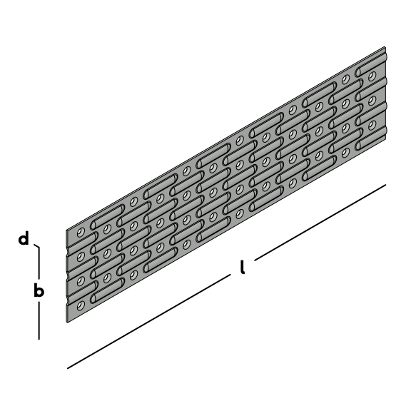 Rechthoekige koppelplaat, voorzien van een regelmatig patroon van versterkingsrillen en spijkergaten. Geschikt om dikkere of bredere houtdelen door middel van spijkeren vlak met elkaar te verbinden.