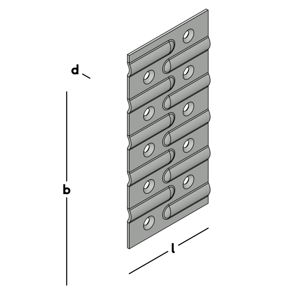 Rechthoekige koppelplaat, voorzien van een regelmatig patroon van versterkingsrillen en spijkergaten. Geschikt om dikkere of bredere houtdelen door middel van spijkeren vlak met elkaar te verbinden.