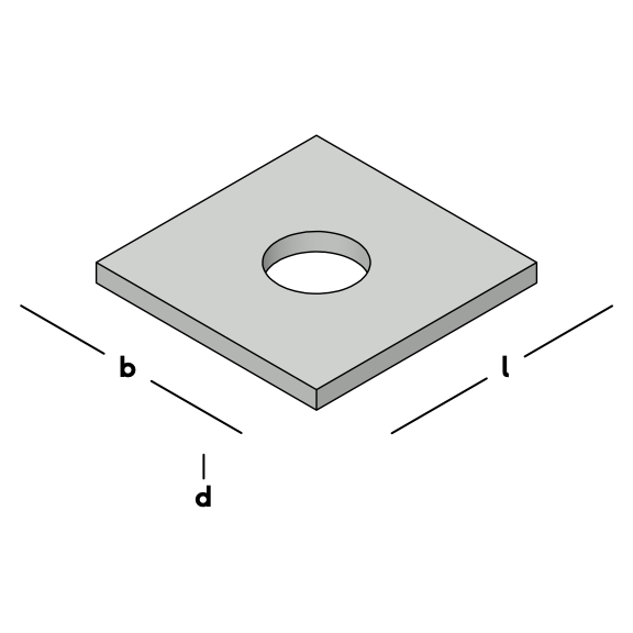 Vlakke vierkante plaat met gat voor gebruik in zware bout/moerverbindingen bij bijvoorbeeld houtverbindingen en betonbekistingen.