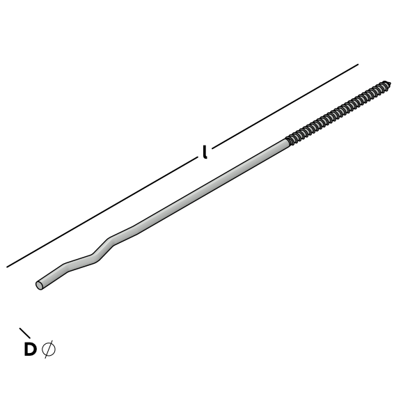 Spouwanker voorzien van houtdraad met punt dat met een indraaihulpstuk in een houtskeletbouw binnenwand wordt gedraaid, waarna de isolatie erop wordt geprikt (en met behulp van een isolatie clip op zijn plaats wordt gehouden) en vervolgens met het gegolfde uiteinde wordt ingemetseld in de buitenmuur.